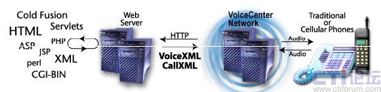 类似地,在Voxeo网络上,语音应用遵从与标准Web页面相同的浏览器模型。所不同的是,不是采用HTML,而是使用电话标记语言(VoiceXML、CCXML或CallXML)来编写页面。经过Voxeo VoiceCenter网络的处理,这些页面将把语音返回给呼叫方。如下图所示: