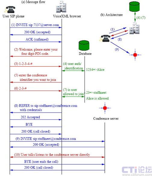 在桥接转移情形,VoiceXML浏览器使用PIN认证主叫方,并在SIP认证中提供自己的机密信息给会议服务器。而在盲目转移情形,如果主叫方使用通过网关连接的传统电话,那么SIP认证将包含网关的机密信息。为了防止恶意用户连接到受限会议,我们在REFER消息中把机密信息从浏览器传递给主叫方网关,随即用于主叫方网关呼叫会议服务器。机密信息可以是浏览器或主叫方的。例如,Refer-To头可能包含sip:staffmeet-