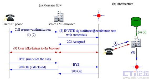 在过去几年,开发人员已经日益使用CCXML给他们的电话系统增加强健的呼叫控制特性。图3展示了如何在VoiceXML与SIP环境中运用CCXML平台进行高级会议控制[4]。在这里CCXML作为SIP的“背靠背用户代理”,面向呼叫者和网络资源(比如VoiceXML浏览器和会议混合器)执行基于SIP的呼叫控制职能,可以基于开放式的行业标准方式创建健壮可靠的多方会议系统。Voxeo