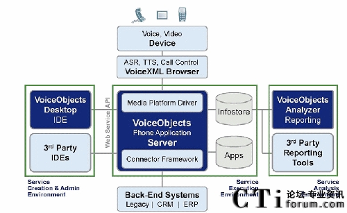 VoiceObjects体系结构支持轻松地开发、部署和维护带有语音、视频、文本和移动互联网接口的电话应用。通过紧密集成提供实时分析的VoiceObjects分析器和提供应用创建与维护的VoiceObjects桌面,VoiceObjects服务器成为提供动态对话和接口生成的执行引擎。