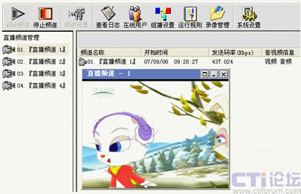 先在直播系统里启动设置好的01号频道,其他教师就可以在各自办公室通过计算机网络观看远教节目,不需淘神费力地到专门的接收室了。如下图: