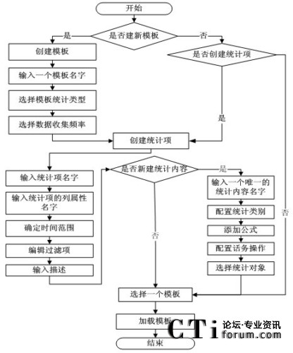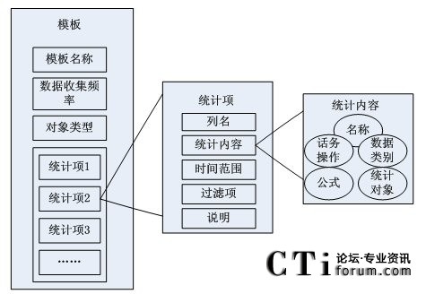 由模板结构框架图得知,模板包括模板名称,数据统计对象,收集数据的频率和多个基本统计项。其中,每个统计项对应着统计对象(如:坐席,路由点等)的一条统计内容信息(如:1小时内的呼叫总量等)。然后由这些统计项和统计参数组合成模板,从而构成对呼叫中心对象的统计信息。