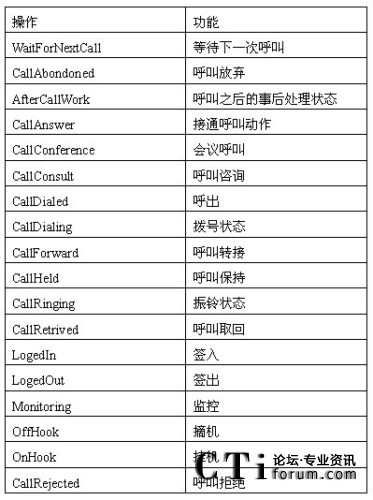在呼叫中心服务器发送事件时,它都会对事件的对象指定的一个状态。在任何时间,ODS源数据库中,每个对象都被指定成一个唯一的状态。这些状态都来自话务对象的操作。