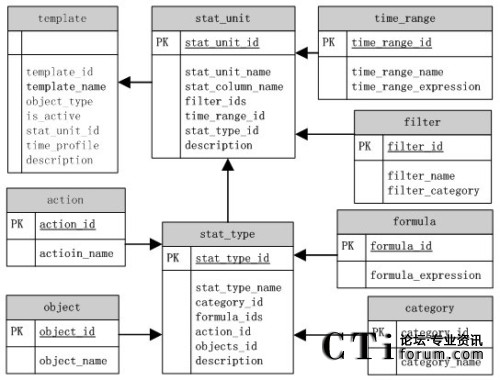 在模板配置存储模型图中,分别建立了单独的表对模板划分的每一个基本对象进行储存。表template存储模板的配置信息,stat_unit表存储了统计项的基本信息,stat_type表是一些有关模板具体内容的配置。各表之间通过各自的ID标识号来进行关联。不过一个模板可以包括多个统计单元,一个统计项可以包含多个过滤项,一个统计内容可以包含多个公式,这样他们之间的ID关联就成为1对多的关系。在这种情况下,父项中的ID关联多个子项ID,其间是用逗号分隔。