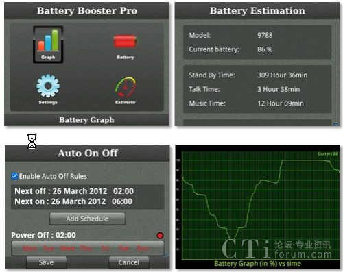 安装了这么多应用,很多同学会考虑我的电池还能hold的住吗?此次,特别为大家介绍一款名为Battery Booster Pro的手机电量管理应用,它可以通过自身具备的五大功能很好的帮用户管理黑莓手机电量:1. 规则制定:用户可以通过它为黑莓手机中的应用设定监测规则,一旦用户忘记关闭某应用,Battery Booster Pro就会跳出警告标志; 2. 自动开/关手机:用户可以为自己的手机设定自动开关时间,以节省不必要得电量消耗;3. 电量提醒,当电量低于一定的百分比后,该应用就会自动提示用户;4. 电量追踪,Battery Booster Pro还可以通过直观的图表显示出设备一天内的电量消耗状况;5. 电量预测,该应用还可以预测出手机所剩的电量在待机、听音乐和电话等情况下的工作时长。