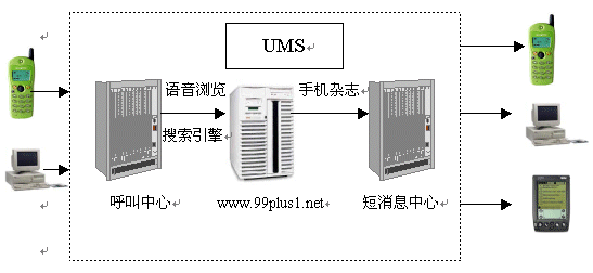 “99+1”统一消息网(以下简称“99+1”)是基于统一消息服务(UMS)平台,应用呼叫中心服务方式,针对移动用户,以“99+1”网站为中心服务渠道,融合了先进的语音合成和语音识别技术,充分实现了话音、数据、短消息等全方位服务方式的综合信息服务网络。