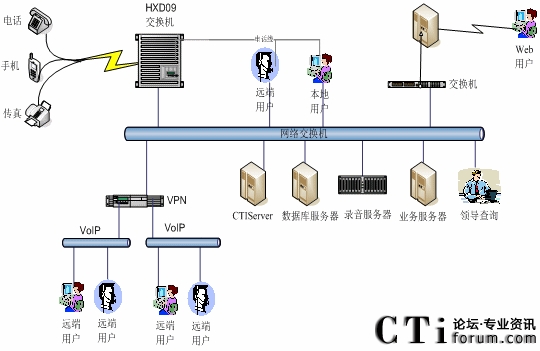 本系统物理结构由交换机、CTI服务器、IVR(交互式语音应答、服务器、业务代表座席(逻辑上分为:普通业务代表座席、专家座席等)、班长座席、统计维护管理工作站、因特网(WEB)服务器、电子邮件(EMAIL)服务器、数据库/应用服务器、录音留言工作站、领导查询工作站、业务网关服务器、通信网关、网络系统等构成。