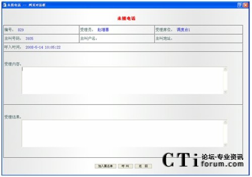 单击某一记录条,可弹开相应的记录单,记录单分为三种:普通电话记录单,未接电话记录单和呼出电话记录单。