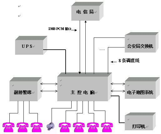 电信局交换机提供单独数字2MB PCM中继接口,通过HDSL传输设备或光端机设备将中继接口连接到公安局指挥中心。若电信局与公安局距离小于500米,则可直接使用75欧姆电缆将中继接口连接到公安局指挥中心。 该数字2MB PCM中继接口的数据可以作成110/119/122混合编程,数据采用收全码方式,被叫控制挂机。