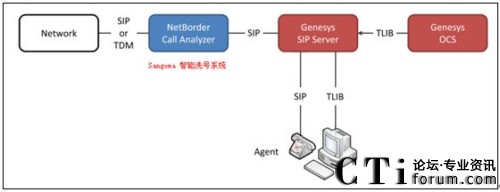 呼叫中心的蓬勃发展带动了呼叫中心厂家投入巨资开发呼叫中心最核心的功能,例如拓展呼叫中心的接入,座席的管理,洗号系统。除了支持Asterisk,Freeswitch平台的高并发A116 16E1做为高并发呼叫中心以外,Sangoma早在2004 年就开始和世界知名呼叫中心厂家Genesys 合作,开发了呼叫中心的洗号系统,远端座席管理,PSTN 接入等强大的工具,从而提高了大型呼叫中心的接通率和座席管理的灵活性。Sangoma 通过genesys 兼容性测试,完全兼容Genesys 呼叫中心平台。NetBorder 系统架构如下: