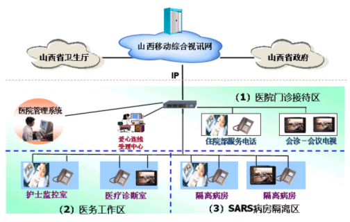 。。山西移动通信公司在获悉远程视讯业务可以有效预防SARS的情况下,随即与山西省政府、省卫生厅通电话,表达了山西移动愿意为山西防治SARS工作提供更先进的通信技术支持。山西移动与华为技术有限公司旋即制定了“爱心连线”远程医疗、远程探视实施方案,省卫生厅及下属太原市7家医院要求尽快实施。目前该系统已经在山西省山大第一医院开通,正值国家卫生部SARS督察小组在山西各大医院视察“防非”工作,整个系统运行稳定,在SARS的防治工作中发挥了重要作用。