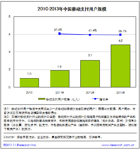 根据艾瑞咨询统计数据,2011年中国移动支付用户规模将达到1.9亿。艾瑞预计,2013年中国移动支付用户规模将达到4.8亿。移动网上支付用户规模的增长带动了整个行业用户规模的爆发,另外手机短信支付也在用户群体中得到了进一步的普及。