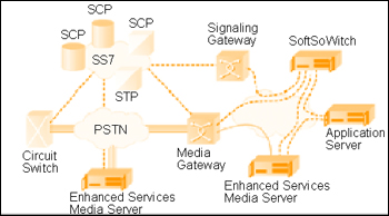 在PSTN网,交换机组、SCP(Service Connection Points)和媒体服务器协同工作,为用户提供服务。在包交换网络环境,这种服务由软件交换机(Softswiches)、媒体服务器和应用服务器协同提供。连接这两种网络的桥梁是媒体网关和信令网关。值得注意的是,包交换中的部件都是逻辑点,其多个部件可能仅仅由网络中的一个应用硬件平台提供。例如:一个基于网络提供语音识别功能的语音邮件系统可能包括如下模块: