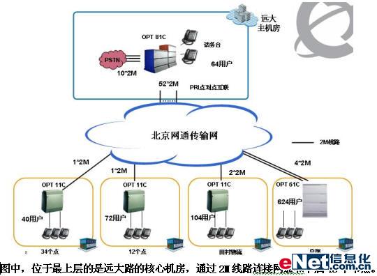 在总体方案上,在远大路核心机房部署的高性能交换机作为全网的核心;各个分支分别配置支持E1中继上联到核心交换机;但同时,各个分支也具备本地的独立工作能力,即使在中继线路出现故障的情况下,也能正常的工作。