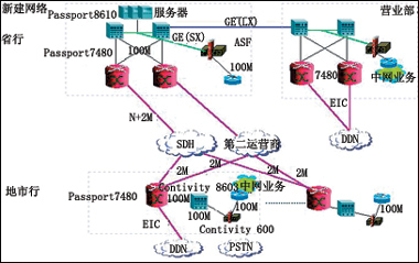 LAN 设备 省行网络中心和地市行配置Passport 8600系列路由交换机,其无阻塞的第三层路由交换可以在128个千兆以太网或384个10/100M自适应端口达到线速的流量,可以充分满足繁重的IP数据流集散。