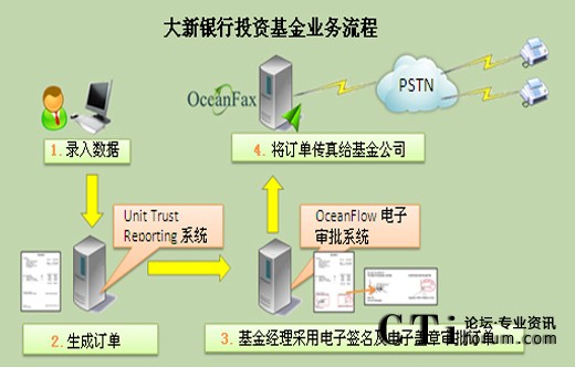 大新银行Information Technology Division作出多方研究及比较,最终选定OceanX旗舰产品、市场增长第一并屡获殊荣的OceanFax传真服务器作为电子传真工具;并与Unit Trust Reporting系统及OceanX另一旗舰产品OceanFlow电子审批系统整合,理顺投资基金业务,实现自动流程,包括订单生成、审批及传真发送流程。