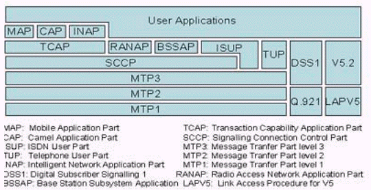 图中MAP,CAP,RANAP,BSSAP为移动通信系统使用的信令;ISUP,TUP,INAP为固定网使用的信令;DSS1和V5.2为接入网使用的信令。