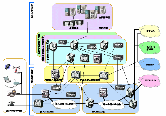 NGN是基于分组技术和多层网络结构的未来电信网络。它可支持所有可能的业务,包括使用各种媒体类型和转播方式的、具有不同性能要求的业务。它的业务与传送分离、控制与用户数据处理分离的构架允许网络中各个部件可分别配备和独立发展。业务的提供采用具有开放接口的业务平台,可以为第三方业务提供者所使用。传送层采用可支持不同带宽和端到端QoS能力的技术。NGN控制功能可分布于现有和新的网络基础设施上并可按组网的要求采用不同的组合形式。网关提供NGN不同域之间或NGN和现有网络之间的互通。NGN支持通用移动性,使用户或其他移动体无论其位置或技术环境的变化都能进行通信和接入业务。它允许用户可以跨越不同的有线或无线接入技术,跨越现有网络的界限使用他们的业务。| AGC Access Gateway Controller AMC Access Management Controller AMG Access Media Gateway AS Application Server BGC Breakout Gateway Controller MAG Multimedia Access Gateway MGC Media Gateway Control Function MGW Media Gateway MMS Mobility Management Subsystem MRC Multimedia Resource Controller MRP Multimedia Resource Processor NAAS Network Access Attachment Subsystem |