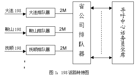 目前辽宁国信公司已经将全省所有寻呼系统排队器与省公司排队器连接,带宽2M,198话路的转接可以通过排队器实现,当各地市用户拨打198特服号进入排队器后,排队器自动将该次呼叫通过与省公司的2M话路转接到省公司的排队器上,并由省公司排队器再转到寻呼中心的话务坐席上,