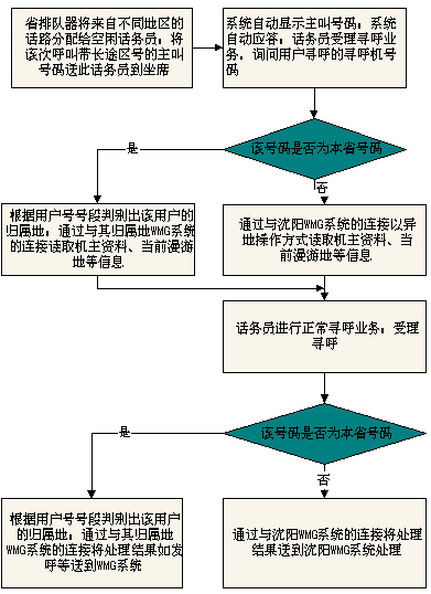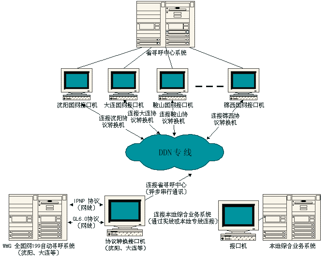本次建设工种相当于在沈阳建设一个大型寻呼中心,处理人工寻呼业务,自动寻呼业务及编码发射等仍由本地WMG系统处理,用户基本资料也以各地WMG系统的资料为基准,寻呼中心与各WMG系统通过一条DDN专线连接,完成数据交换。