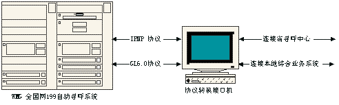 通过网线与WMG系统建立两条连接,一条为IPNP协议发呼,一条为GL6.0协议修改资料,另外还通过串口与省寻呼中心接口机及本地营销系统连接,主要功能为接收来自省寻呼中心或营业系统接口机的请求,将其转换为WMG标准协议并送到WMG进行处理,并将处理结果传回协议转换接口机,由协议转换接口机将结果传回请求地,实现WMG自动寻呼系统与人工寻呼及营业系统的数据交换。