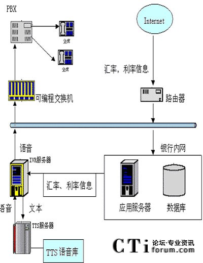 银行可从网上下载汇率信息或利率信息,之后将这些信息的文本传递给IVR服务器,IVR会通过调用TTS服务器得到这些信息的语音流,之后就可以在坐席上播放这些汇率或利率的语音了。