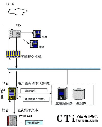 用户可以通过电话提交他的查询请求(比如使用按键方式,提交个人卡号等),IVR服务器收到请求后会向其他应用服务器提交此查询请求,当IVR得到查询结果后,他会将文本形式的查询结果交给jTTS服务器,jTTS服务器会返回查询结果的语音形式,最终语音会在坐席上播放,用户就可以听到他刚才所要查询的信息。