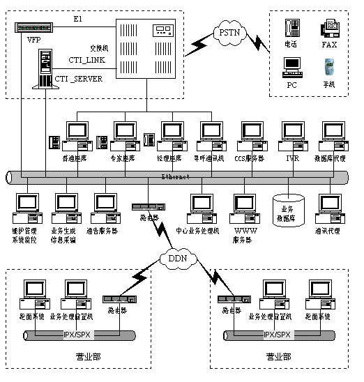 结构模式 : 采用全省统一平台模式的板卡式分布系统。各地市行客户服务中心使用统一的号码95588接入系统。与帐务处理有关的交易均通过网关发送到省行大机处理;人工座席业务等全部在当地客户服务中心处理