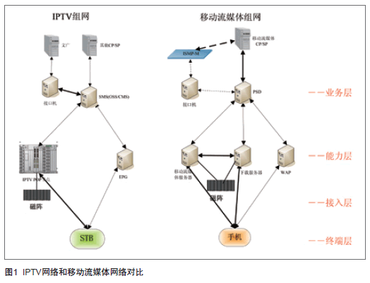 如图1所示,左边为IPTV网络,右边为移动流媒体网络。