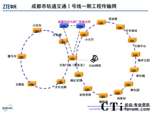 成都地铁一号线一期工程公安通信传输系统由17套MSTP 10G设备、2套MSTP 155M设备,19套嵌入式组合电源、1套网络级网管设备构成。MSTP设备为传输系统提供2M、10M、100M、1000M接口。每个节点一套嵌入式组合电源设备,为MSTP设备和接入设备提供-48V直流供电。会展中心设置一套网络级网管,对整个传输系统进行管理。