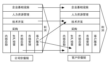 企业的主要活动都是具有相应价值的,这些活动构成了企业的价值链,企业价值链首先表现为企业内部的联系和支撑,各种活动相互配合,才能产生价值和利润;其次,企业的活动和上游供货商和下游用户紧密联系,相互影响。显然,供货商、用户的各种活动方式能够直接或者间接地影响企业的成本、利润和竞争优势,同样,企业的各种活动也将对它们产生很大的影响。