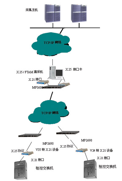 该方案采用了两台迈普MP2600和一台迈普MP3600,分别担任接入层和汇聚层路由设备,组成一个广域网。程控交换机提供X.21数据接口,走X.25协议。两台MP2600路由器可担当网络分支路由器,其串口可以外接V.35转X.21或V.24转X.21设备转换成X.21接口;