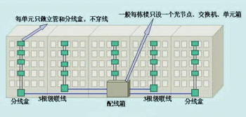 目前有一种基于以太网方式的VDSL,接入技术使用QAM调制方式,它的传输介质也是一对铜线,在1.5公里的范围之内能够达到双向对称的10Mbps传输,即达到以太网的速率。如果这种技术用于宽带运营商社区的接入,可以大大降低成本。基于以太网的VDSL接入方式示意图见图5,方案是在机房端增加VDSL交换机,在用户端放置用户端CPE,二者之间通过室外五类线连接,每栋楼只放置一个CPE,而室内部分采用如图6所示的综合布线方案。这样做的原因是: 近两年宽带建设牵引的社区用户上网率较低,一般在5%~10%左右,为了节省接入设备和提高端口利用率,故采用此方案。