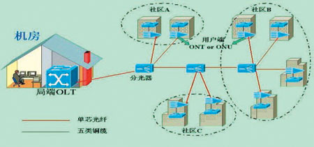 PON(无源光网络)技术是一种点对多点的光纤传输和接入技术,下行采用广播方式,上行采用时分多址方式,可以灵活地组成树形、星形、总线形等拓扑结构,在光分支点不需要节点设备,只需要安装一个简单的光分支器即可,具有节省光缆资源、带宽资源共享、节省机房投资、设备安全性高、建网速度快、综合建网成本低等优点。