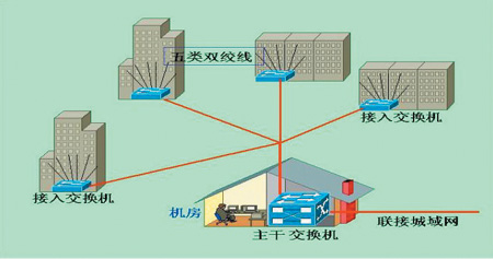 LAN方式接入是利用以太网技术,采用光缆+双绞线的方式对社区进行综合布线。具体实施方案是: 从社区机房敷设光缆至住户单元楼,楼内布线采用五类双绞线敷设至用户家里,双绞线总长度一般不超过100米,用户家里的电脑通过五类跳线接入墙上的五类模块就可以实现上网。社区机房的出口是通过光缆或其他介质接入城域网。LAN方式接入示意图见图9所示。