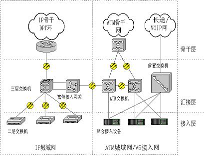 ATM城域网/V5接入网按网络结构分,可分为骨干层/汇接层/接入层。分别采用了ATM OVER SDH技术和V5接入网技术。
