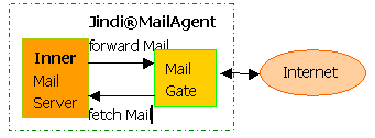 这种方案一般比较适合10人左右的中小企业。内部局域网架设一台邮件服务器,实现内部邮件收发;同时,在共享上网服务器(一般是PPP/ISDN/ADSL拨号服务器)安装网关软件,定时发送外部邮件,同时收取外部邮件进行本地分发。网关软件有通用网关软件,如WinGate, WinRoute, WinProxy, 一般可以实现 http/ftp/smtp/pop3协议的应用层代理;还有专门的邮件网关软件如Mdaemon, FetchMail, MailGate等,除了完成内外部邮件交换外,还有邮件监控、邮件过滤等功能。Jindi MailAgent 是一款将MailServer和 MailGate合二为一邮件代理,拥有邮件服务器和邮件网关的所有功能,同时还可以实现邮件监控等功能。
