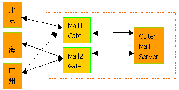 1.正常工作时北京的内部邮件服务器通过Mail1 Gate与外部邮件服务器通讯,上海、广州通过 Mail2 Gate与外部邮件服务器通讯;