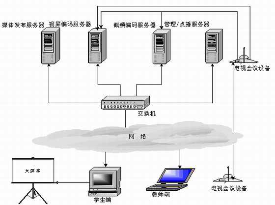 当老师端在异地时(摄像头离服务器较远,无法物理连接),可通过“电视会议系统”将老师的图像及声音实时传送到编码服务器,桌面课件可以通过PcAnywhere传送到编码服务器。图像,声音和桌面课件通过Web Streaming采集压缩并在网上实时广播。这种系统架构也是当今功能比较齐全和完善的一种实现方式。