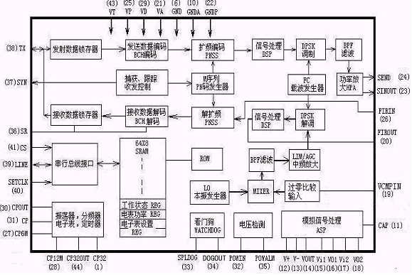 多年来国内外民用低压电力线载波通讯一直停留在实验室阶段,近年来许多企业生产民用电力线载波抄表在使用中抄表率均未能达到100%和准实时。其原因是电力线网络非规则,使信号传输受到电力网各种干扰信号阻塞,成为一时难以跨越的障碍。目前国外生产的各种通信芯片还不适应于我国电力线载波通信,根据通信理论,运用直序扩频方式63位伪随机码技术,开发设计出来的SC1128载波通信芯片,该芯片为0.5μm