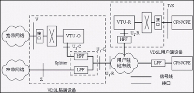 VTU-R分别是位于局端和用户端的VDSL收发器。业务分离器(Splitter,包括HPF和LPF)将同一对电话铜缆上传输的VDSL与窄带业务(或ADSL)