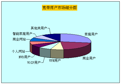 图4是宽带用户细分市场分布图,从中可以看出,用户种类主要有:家庭上网用户、商业上网用户、VPN用户、VOIP用户、NVD用户、个人网站、商业网站、智能家庭用户。