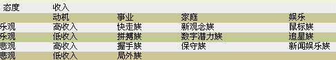 9.新闻娱乐族(Meida Junkies):高收入、以娱乐为取向的组群,多不会使用个人电脑,是视觉产品的消费者。