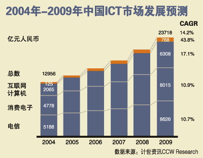 在不断变革前进的洪流中,中国信息和通信技术(Information and Communication Technology,ICT)市场在融合中将迎来黄金的5年。市场总值将从2004年的12956亿元人民币增长至2009年的23718亿元人民币。