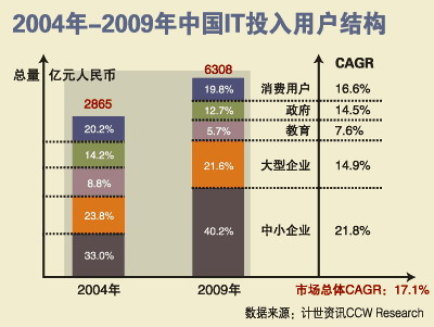 行业市场依然是中国IT市场的主动力,行业市场占中国IT总支出的80%,消费市场占20%。在行业市场中,商业市场占59%,政府占14%,教育占8%。根据计世资讯的预测,到2009年,中国的IT投入将达到6308亿元人民币。其中中小企业占40.2%,大型企业占21.6%,消费用户占19.8%,政府占12.7%,教育占5.7%。从2004年到2009年,中小企业的CAGR(复合年增长率)达到21.8%,大型企业的CAGR达到14.9%。