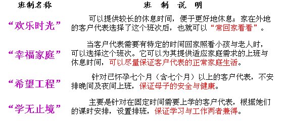 通过流程优化,可以大大提高组织的运营效率和工作质量,如:我们通过对员工排班流程的优化,大大提高了客户服务中心人员的利用效率、服务质量,同时,还提高了员工满意度。我们通过对流程中第3、4、5步工作方法的改进,大大提高了人员利用率,且提高幅度达20%以上。同样,通过对第6步班次设置的改进,实施了个性化的班次设置(见表2),如:针对喜欢有整天休息时间,及家在外地的客户代表,设置了“欢乐时光”轮班,为大家提供较长的休息时间,如两天以上的连休,便于回家与更好地休息;针对家里有小孩子或老人、需在固定时间回家的客户代表,设置了“幸福家庭”轮班,为他们提供适应家庭需求的上班与休息时间,尽量保证员工的正常家庭生活;针对已怀孕及哺乳期的客户代表,设置了“希望工程”轮班,不安排晚间及夜间上班,保证了母子的安全与健康;针对在固定时间需要上学的客户代表,设置了“学无止境”轮班,主要是根据她们的课时安排设置排班,保证学习与工作两者兼得。这种做法大大加强了员工积极性,并提高了员工的满意度。