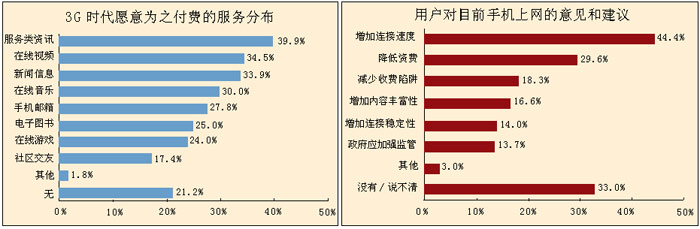 目前用户对手机上网的意见主要集中在速度和资费方面,要求增加速度的比例超过了所有用户的4成,降低资费和减少收费陷阱的比例分别为29.6%和18.3%。