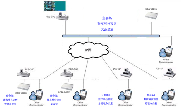 在此方案中,在张江科技园区大会议室配置一套SONY PCS-G70旗舰型视频会议终端。并在此终端内安装了支持6点多点会议的H.323内置多点MCU。