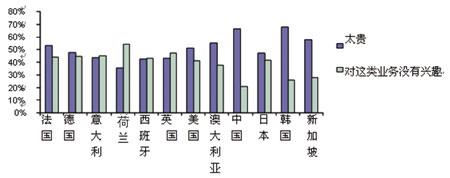 除了每周使用量之外,Ovum还向被调查者询问是什么因素阻碍了他们通过手机应用上述程序,被提及的最大顾虑是价格昂贵,其次是没有兴趣。在欧洲一些国家,对业务不感兴趣是和费用昂贵同等重要的原因,在荷兰,选择对移动业务不感兴趣的比例甚至超过了认为费用昂贵的比例。此外很有趣的是,没有一个被调查者表示因为手机没有这些功能而导致无法使用业务。(见图4)