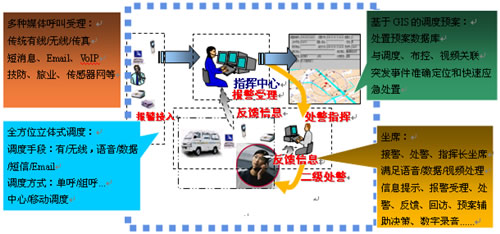 接处警应用系统是应急联动中心的核心部分,系统在保证“先进、实用、可靠”的前提下,与全市应急联动单位实现互联互通、信息共享;把接处警系统与GPS、有无线通信、视频监控、预案指挥等技术系统有机的结合在一起,形成“以计算机网络为基础,以有线、无线通信为纽带,以接处警信息传递、处理为核心,以资源共享和计算机辅助决策为载体的综合性系统工程”,从而提高应急联动中心的指挥调度、辅助决策等综合处置能力,满足在复杂条件下指挥、调度、协调、处置城市不同种类和等级的突发事件的实战需要。